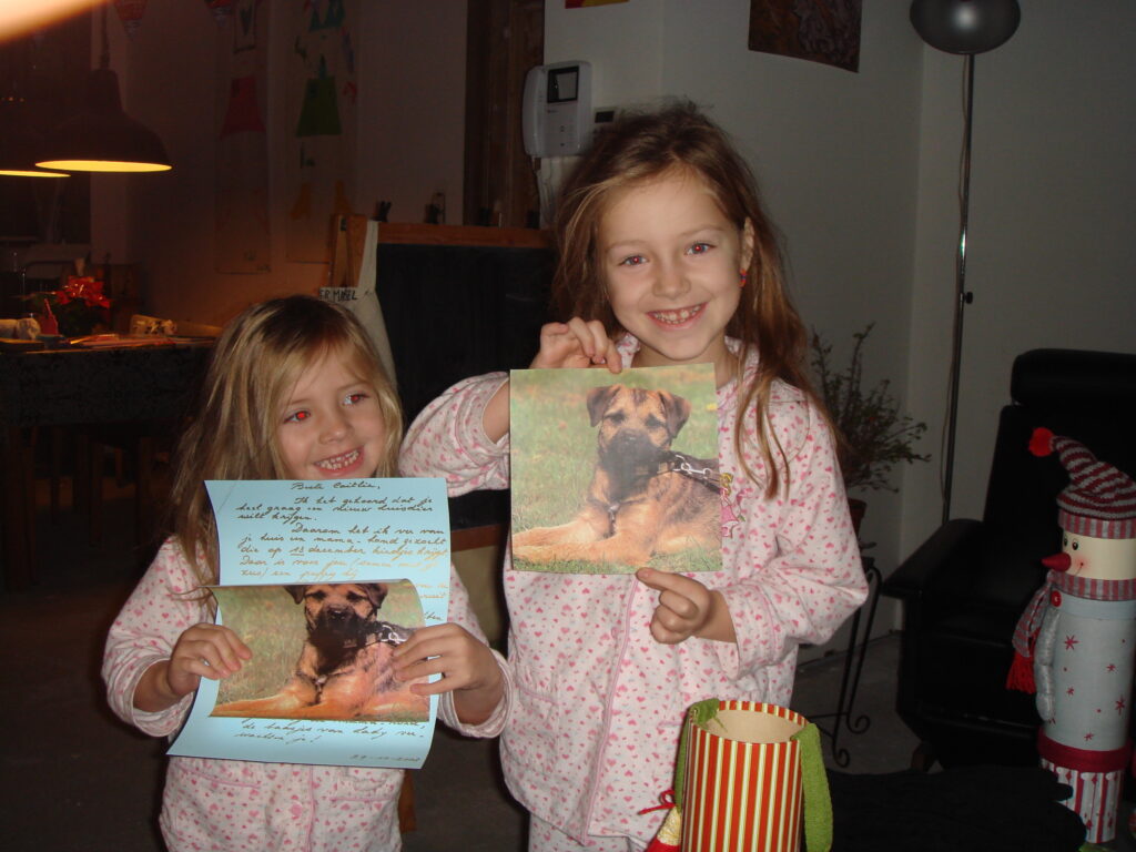 Daarna was het het moeilijkste om een plan te bedenken om het aan de kinderen te vertellen. Mijn mama kwam op het idee Sinterklaas een mooie brief te laten schrijven. In die brief stond de boodschap dat er in december een hondje zou worden geboren dat bij hen mocht komen wonen. De gelukkige gezichten op de foto verklappen alvast het gejuich dat straten ver te horen was.